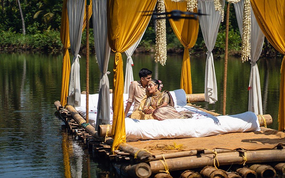 Embrace the tranquility of Kerala’s backwaters for a serene and intimate wedding. Exchange vows aboard a traditional houseboat as you glide through the peaceful waters, surrounded by lush greenery. The gentle lull of the backwaters and the vibrant local culture make for a unique and unforgettable celebration. #KeralaWedding #BackwatersBliss